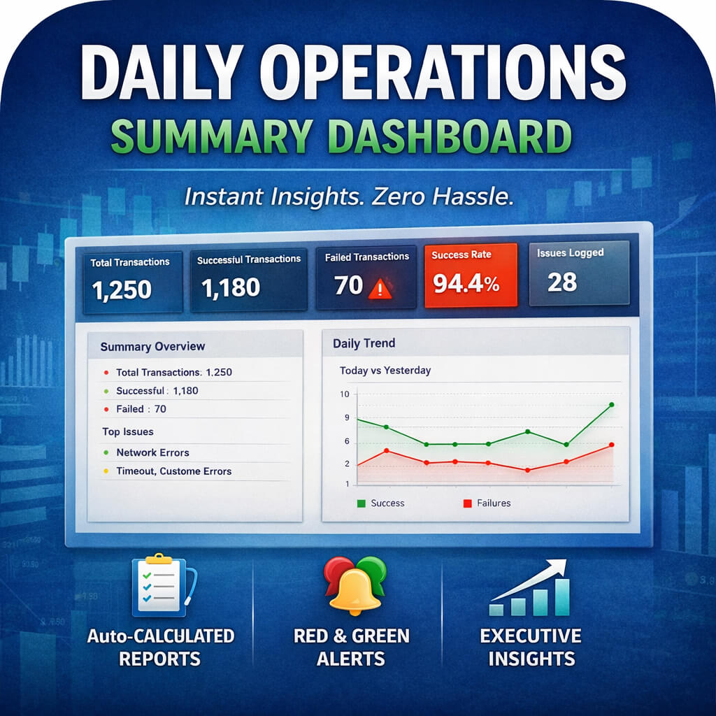 Designed specifically for fintech, payments, and operations-driven teams, this dashboard acts like a silent operations assistant—preparing reports, highlighting risks, and saving time every day.