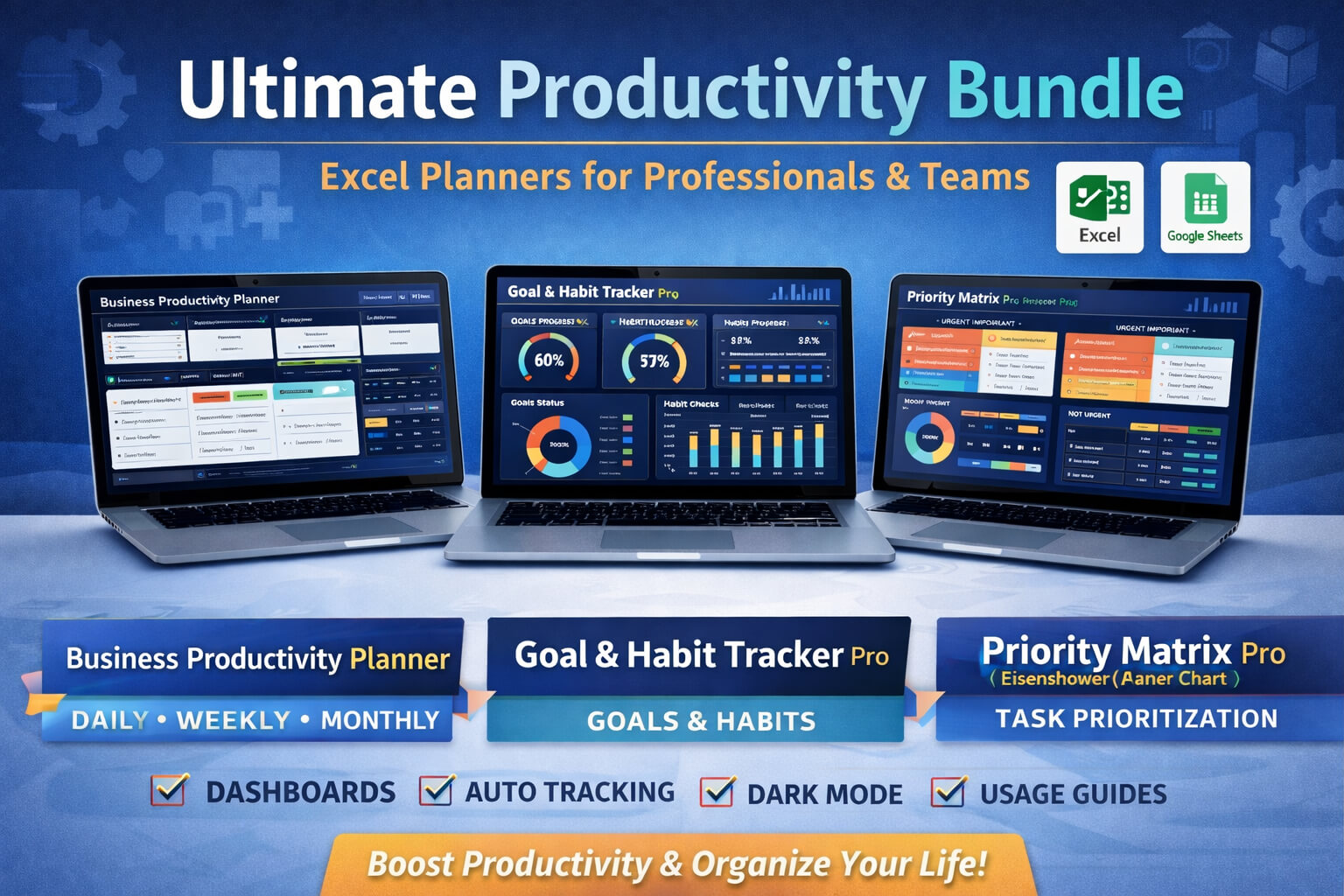 Take control of your time, goals, and priorities with the Ultimate Productivity Suite, a bundle of three premium Excel-based planners designed to help professionals, entrepreneurs, and teams work smarter, stay organized, and achieve results.