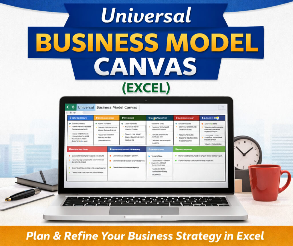 The Universal Business Model Canvas is a fully editable Excel template that helps you visualize your business strategy, define key resources, track revenue streams, and clarify customer value.